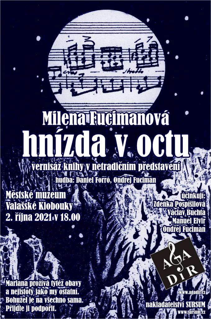 Vernisáž knihy Mileny Fucimanové "Hnízda v octu" v netradičním představení Divadla hudby a poezie Agadir. Sál Staré radnice, sobota 2. října 2021, 18.00. Hudba: Daniel Forró a Ondřej Fuciman. Marie prožívá tytéž obavy a nejistoty jako my ostatní. Bohužel je na všechno sama. Přijďte ji podpořit.